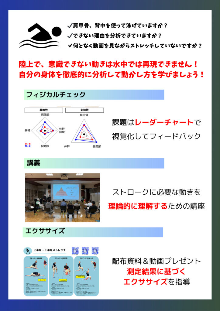 陸上での動きを水中に活かすための座学、測定、エクササイズ指導を行います。